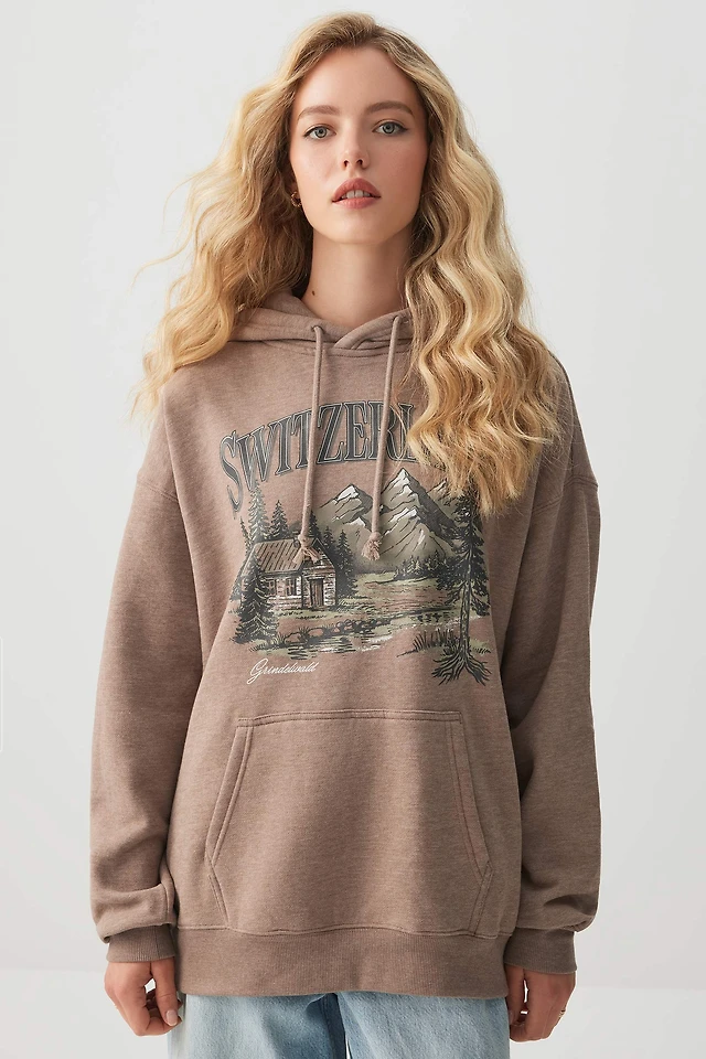 Ardene Printed Oversized Hoodie in Beige | Size | Polyester/Cotton | Fleece-Lined | Eco-Conscious