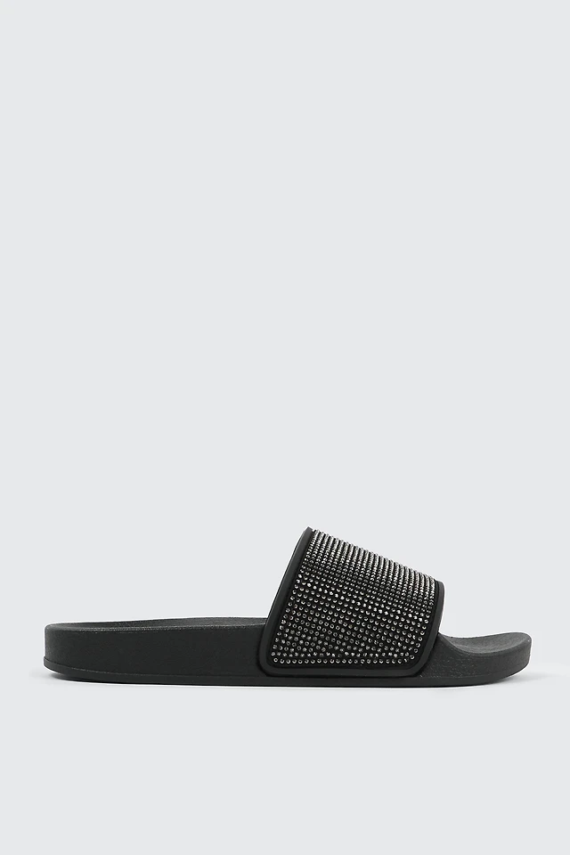 Ardene Rhinestone Slides in Black | Size