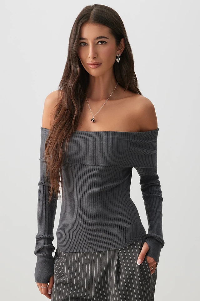 Ardene Rib Off Shoulder Sweater in Dark Grey | Size | Polyester/Polyamide/Viscose