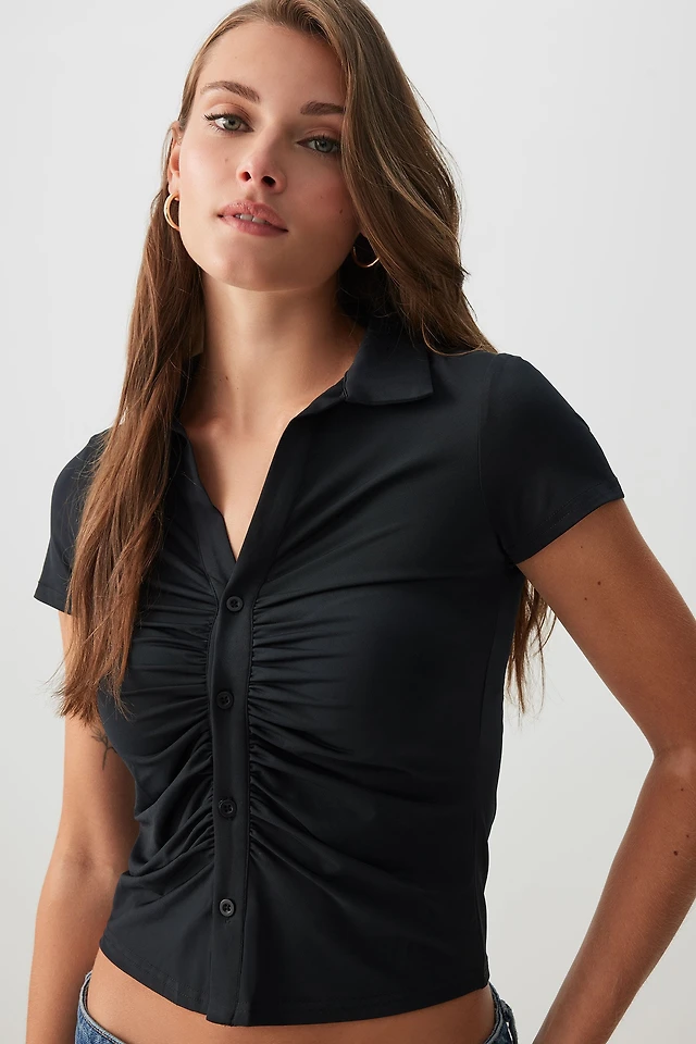 Ardene Ruched Short Sleeve Shirt in Black | Size | Polyester/Elastane