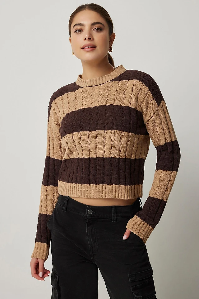 Ardene Striped Cable Knit Sweater in Beige | Size Large | Polyester