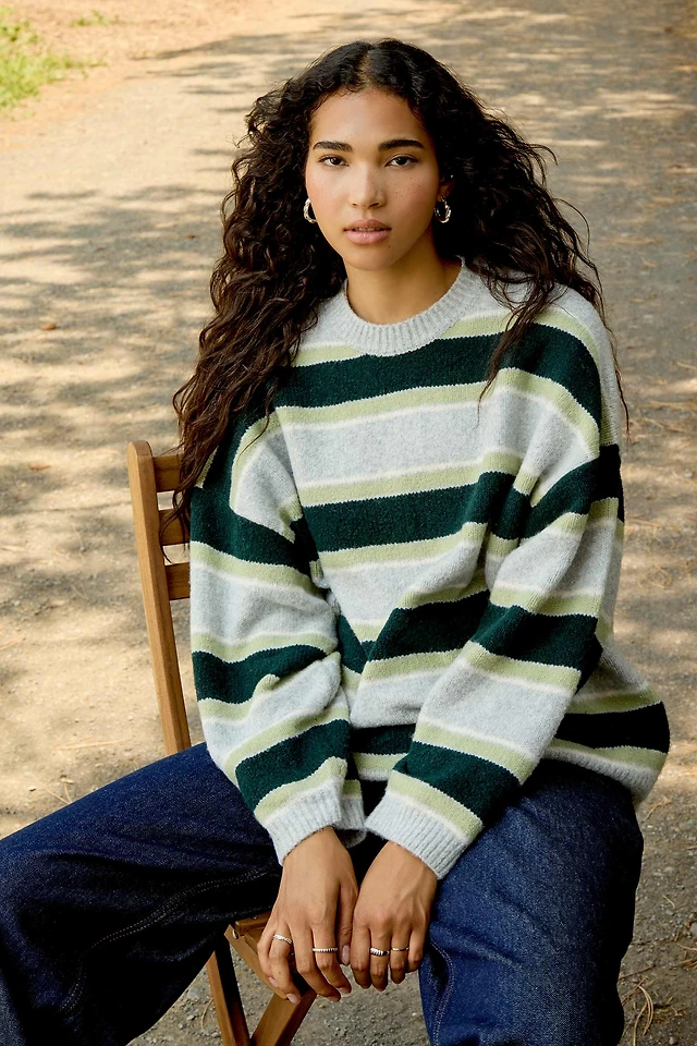 Ardene Striped Oversized Moss Stitch Sweater in Dark Green | Size | Polyester/Elastane