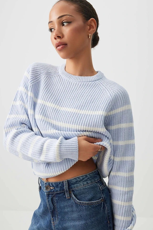 Ardene Striped Raglan Sweater in Light Blue | Size | Cotton