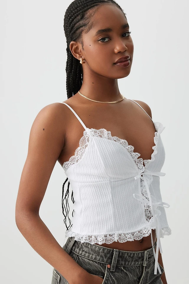 Ardene Tie Front Tank Top with Lace Trim in White | Size XS | Polyester/Spandex