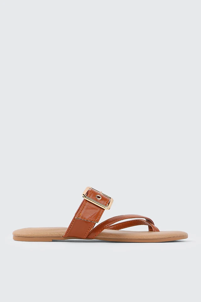 Ardene Toe Loop Flat Sandals with Chunky Buckle in Cognac | Size | Faux Leather | Eco-Conscious