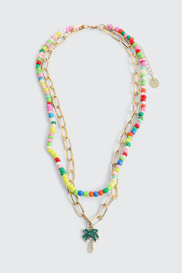Ardene Two-Row Bead & Chain Palm Tree Necklace in Gold