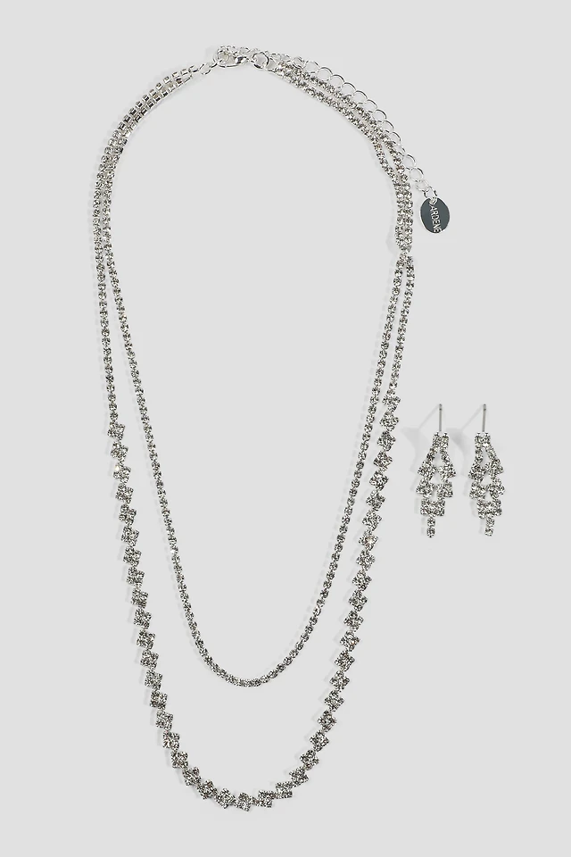 Ardene Two-Row Rhinestone Necklace & Earrings Set in Silver | Stainless Steel