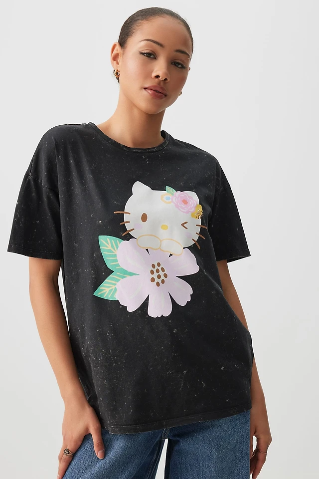 Ardene Washed Oversized Sanrio T-Shirt in Black | Size XL | 100% Cotton