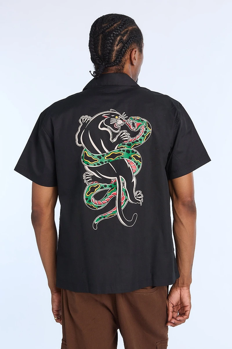 Short sleeved twill shirtArsenic logo printed on the chestPanther and snake graphic printed on the back2 front chest flap pocketsButton-up closureBoxy fit65% Polyester, 35% CottonMachine wash inside out in cold water - Gentle with like colours - No bleach - Tumble dry low - Low iron on reverse sideImported by ArsenicStyle #1802-31832504