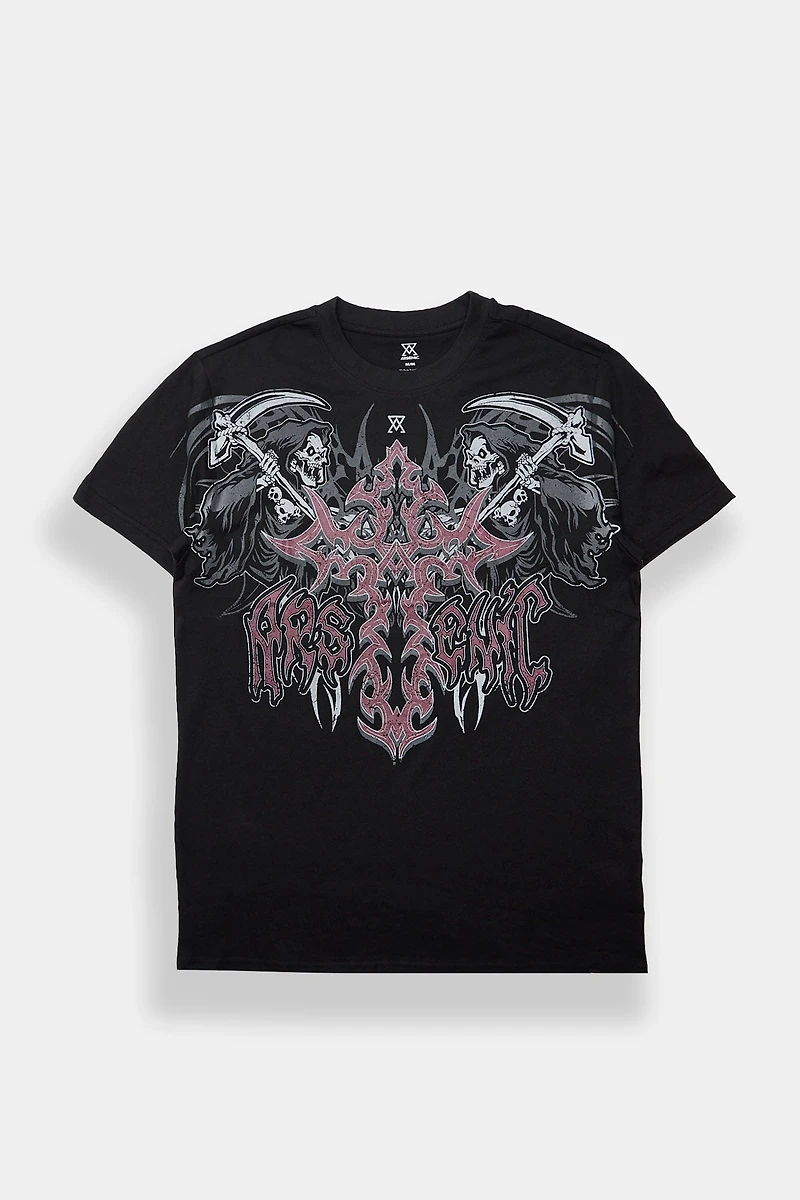 Men's t-shirtArsenic Reaper cross graphic printed on the chestWoven brand label on the bottom hemCrew neckRegular fit60% Cotton, 40% PolyesterMachine wash inside out in cold water - Gentle with like colours - No bleach - Tumble dry low - Low iron on reverse sideImported by ArsenicStyle #1650-40912610