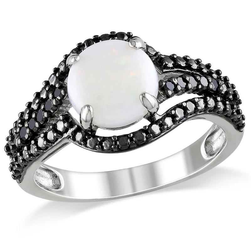 Cette bague Cocktail ajoutera une touche de brillance séduisante à vos tenues. Façonnée en argent sterling lustré, la bague met en valeur une opale ronde (8mm) ainsi que 10 diamants noirs ronds sertis sur griffes le long de l'anneau.Les bijoux Asteria: Conçues par les diamants, les gemmes et les perles reflètent la séduction et le mystère lors de la chute de l’obscurité. Ces designs captivants possèdent une beauté unique ainsi que une qualité intemporelle.
