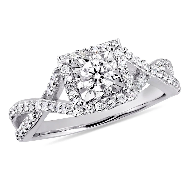 Offrez à votre âme-sœur cette bague de fiançailles entrecroisée Miabella au design unique et élégant qu'elle chérira à tout jamais. Façonnée en argent sterling lustré et rehaussée d'une finition brillante, la merveilleuse bague met en valeur un diamant rond serti clos (G-H, I2-I3) en son centre ainsi qu'une auréole de 10 diamants ronds scintillants sertis sur griffes. Le motif entrecroisé est davantage orné de 48 diamants ronds. Les bijoux Miabella: Un bijou parfait est un accessoire éblouissant et très particulier qui vous accompagnera toute une vie. Avec plus de 30 ans d'expérience en création de bijouterie fine, Miabella a tout ce dont vous recherchez pour souligner une occasion spéciale à l'aide d'un petit quelque chose qui étincelle. Miabella - l'harmonie dans la bijouterie. La vie est une symphonie, célébrez-la!