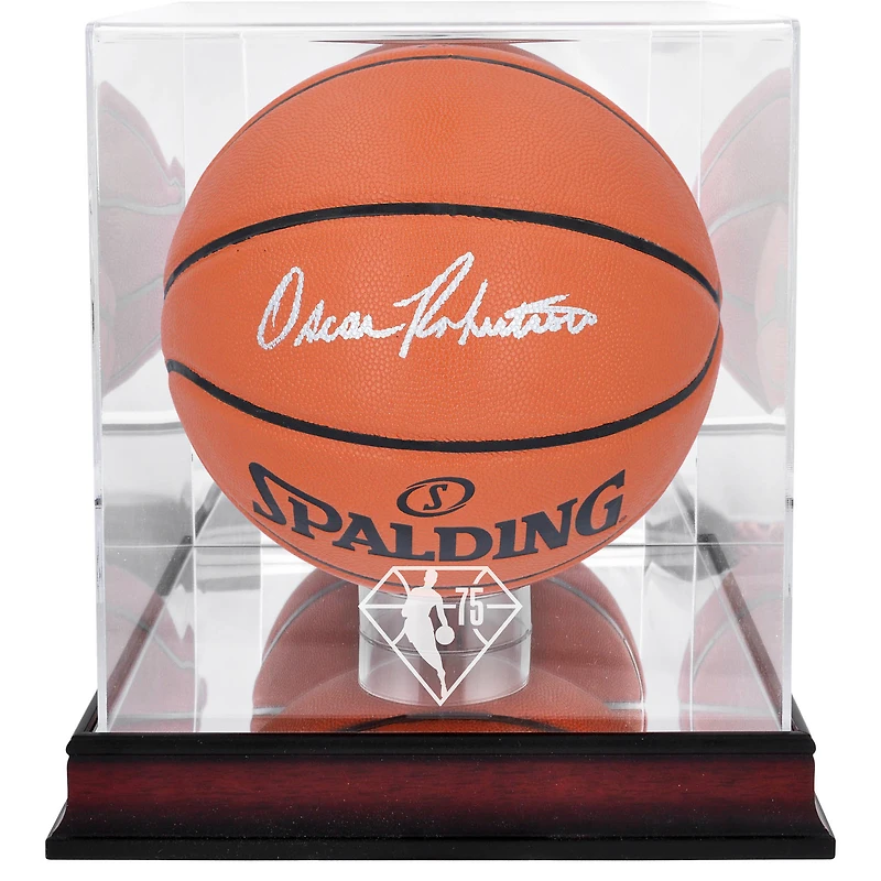 Ballon de basket d'intérieur/extérieur Spalding autographié par Oscar Robertson Milwaukee Bucks avec vitrine en acajou du logo du 75e anniversaire de la NBA