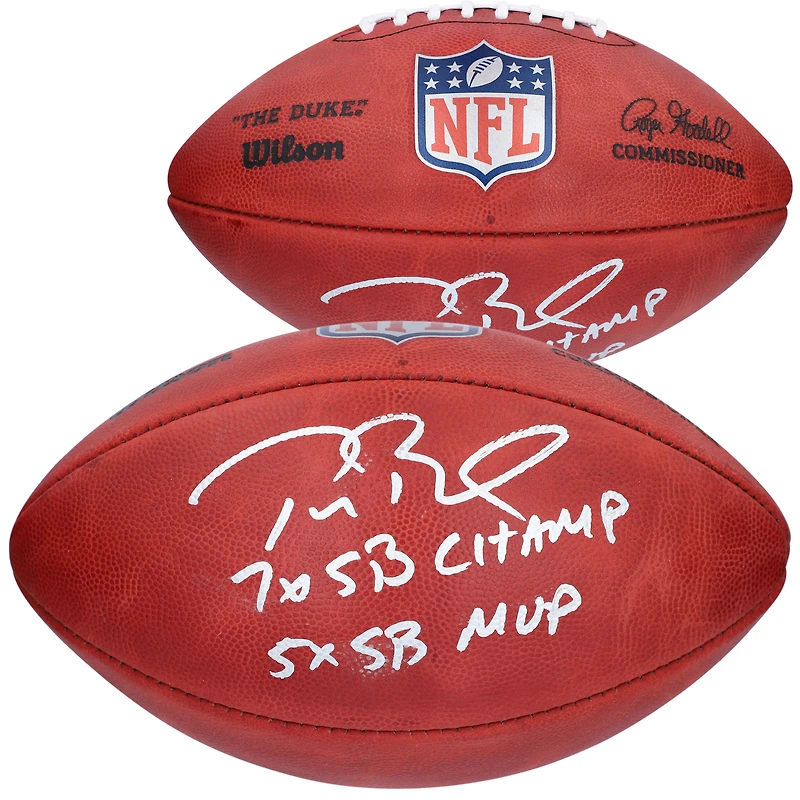 Ballon de football Wilson Duke dédicacé par Tom Brady des Tampa Bay Buccaneers avec les inscriptions « 7x SB Champ » et « 5x SB MVP »