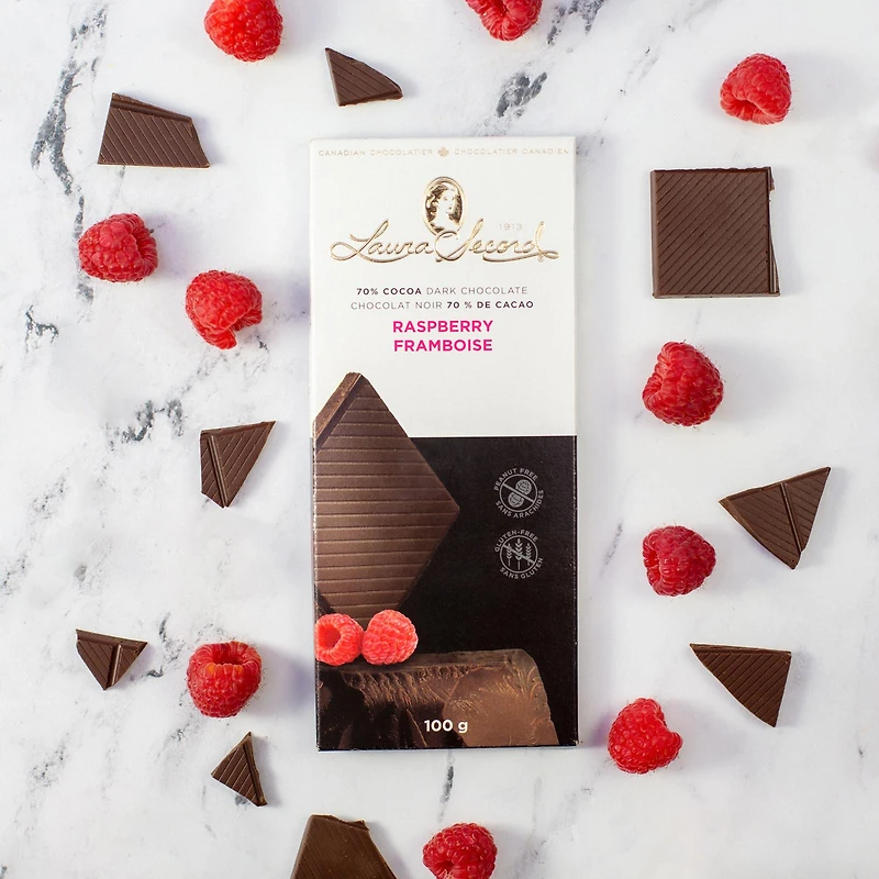 100 g de pur bonheur, sans aucun doute! Dites bonjour à notre barre chocolat noir 70% et framboise à laquelle il vous sera impossible de résister.