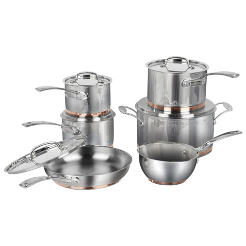 Batterie de cuisine de 11 pièces incluant une casserole de 0,9 l (1 pte) avec bec verseur, une casserole de 1,4 l (1,5 pte) avec couvercle, une casserole de 1,9 l (2 pte) avec couvercle, une casserole de 2,8 l (3 pte) avec couvercle, une casserole de 5,7 l (6 pte) avec couvercle, et une poêle de 9,5 po (24 cm) avec couvercle Construction professionnelle à cinq épaisseurs avec couches en acier inoxydable, aluminium et cuivre assurant une distribution de la chaleur et une durabilité supérieures Poignées en acier inoxydable moulé Cool Grip conçues pour offrir une prise sûre et confortable Poignées conçues pour rester froides sur la cuisinière Couvercles bien ajustés emprisonnant l'humidité et les nutriments pour des résultats plus sains et plus savoureux Pièces allant au four jusqu'à 500°F (260°C), ce qui permet de les utiliser sur la cuisinière, dans le four et sous le gril