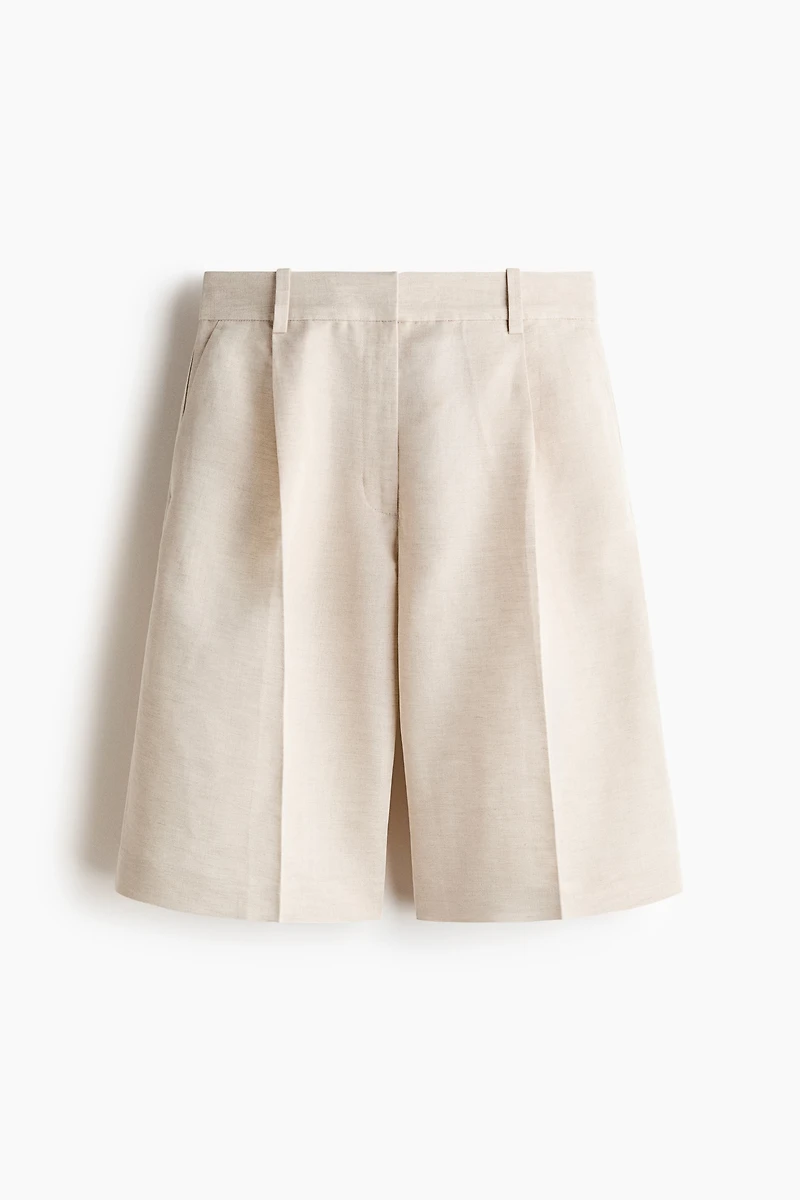 Short au genou en matière tissée. Modèle avec pinces devant et braguette à fermeture éclair surmontée d'un bouton et d'une fermeture par agrafe et barrette dissimulés. Poches italiennes et poches raglan munies d'un bouton décoratif dans le dos. Plis marqués devant et dans le dos.