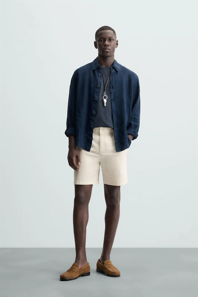 Bermuda regular fit confectionné en tissu avec coton et élasticité. Taille avec détail de plis avant. Poches avant et détail de poches arrière double passepoilées avec bouton. Effet légèrement délavé. Fermeture avant avec fermeture éclair et bouton.