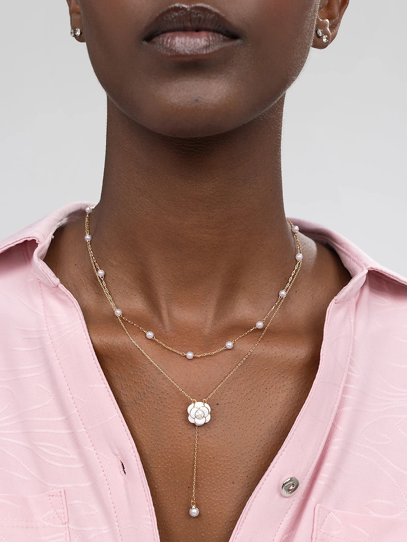 Collier composé de deux chaînes fines en métal doré superposées. La chaîne supérieure est ponctuée de perles sphériques, et la chaîne inférieure supporte un pendentif floral avec un élément pendant terminé par une perle.