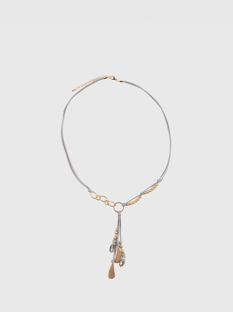 Collier composé d’un cordon textile gris avec fermoir mousqueton métallique et chaînette d’extension. L’avant présente des anneaux métalliques dorés, des pierres facettées et des éléments pendants fixés par des nœuds.