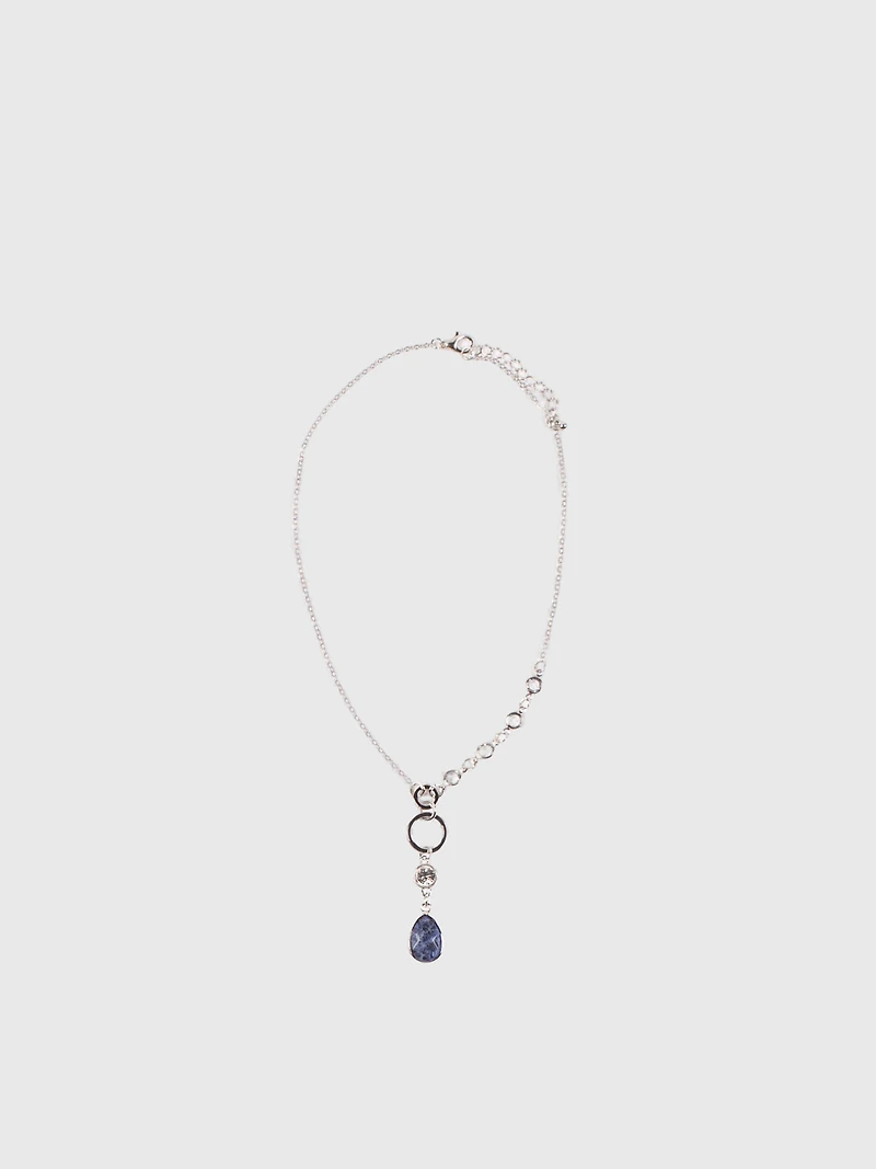Collier composé d’une chaîne fine en métal argenté avec fermoir mousqueton et chaînette d’extension. La partie frontale intègre un anneau circulaire et un pendentif en pierres facettées de forme ovale monté sur un support métallique.