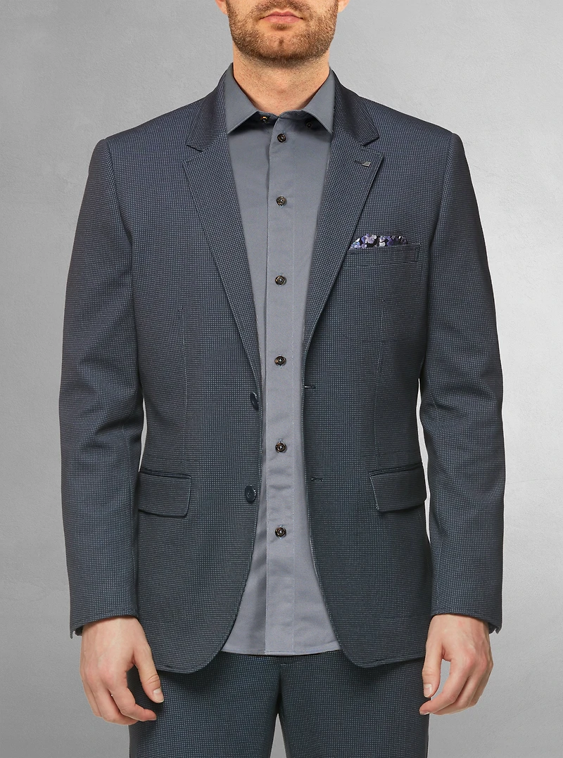 Description: Rehaussez votre style avec ce blazer stretch pour homme, confectionné dans une maille à mini-pois du plus bel effet et orné de finitions contrastées audacieuses. Profitez d'un confort incomparable grâce à sa doublure stretch et ses empiècements aux épaules, conçus pour une liberté de mouvement optimale.