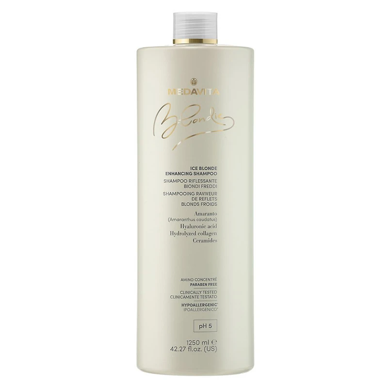 Grâce à la présence de pigments, il rehausse les reflets cendrés, cendrés-irisés, irisés. Nettoie délicatement en repulpant la structure capillaire et en rehaussant les reflets. Contient du Collagène hydrolysé, reconstituant et conditionnant, de l’Acide hyaluronique, hydratant et élastifiant, des protéines d’Amarante, hydratantes, protectrices, filmogènes ; un précieux complexe de Céramides, à l’action restructurante et lissante de la fibre, qui en augmente la vigueur et la résistance et le complexe Amino Concentré.