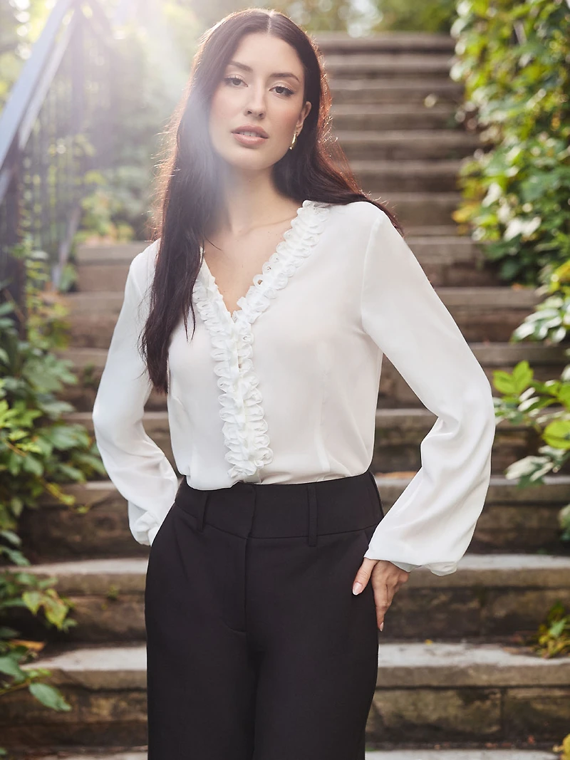 Mettez à jour votre garde-robe avec cette blouse ajustée, ornée d'une délicate broderie qui souligne l'encolure pour une touche féminine et raffinée. Ses manches volumineuses équilibrent la silhouette, créant un look élégant et décontracté, ce qui la rend parfaite pour toutes les occasions. Portez-la avec un pantalon pour le travail, un jean pour vos sorties du week-end, ou sous un blazer pour un look sophistiqué et facile à porter.Tissu CDC tisséCol en VBordure soutache brodéeManches longues avec poignets boutonnésFermeture à boutonsLa mannequin porte la taille TPMatière: 100% polyesterLaver en machine à l'envers à l'eau froide