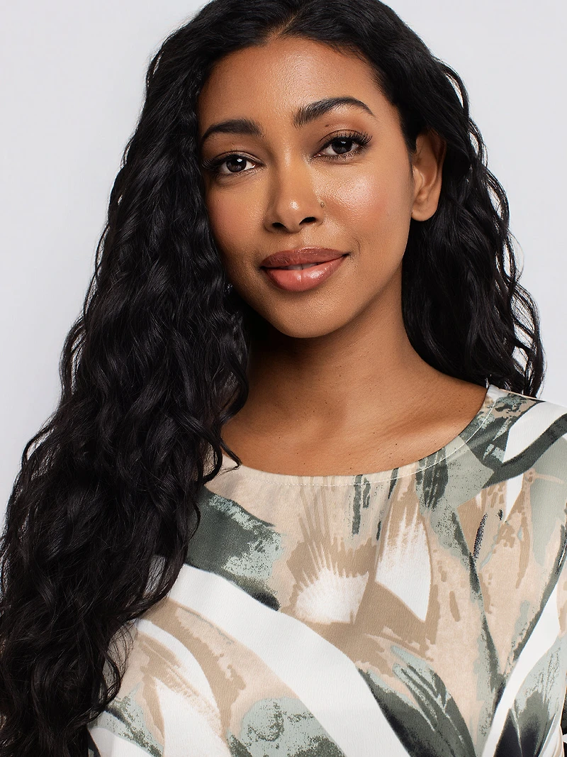 Blouse à motif abstrait, dotée d’une coupe ample avec une longueur aux hanches, une base arrondie et un col rond. Elle présente une encolure ronde sans ouverture frontale, ainsi qu’une fermeture au dos par bouton avec une fente goutte. Les manches courtes sont complétées par une finition repliée.