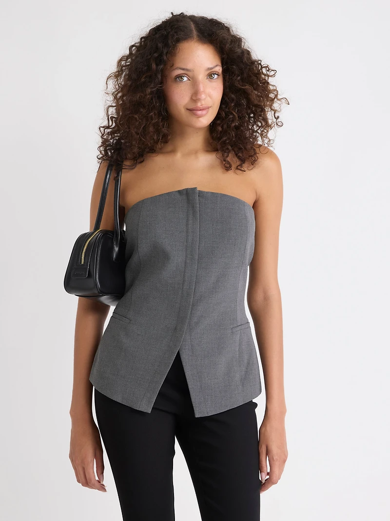 Cette unique blouse bustier conçue en sergé gris foncé ajoutera une touche festive à votre tenue professionnelle. Une version moderne du classique veston qui saura assurément se démarquer. Coupe - Ajustée : Coupe près du corps épousant la silhouette - Sans manches - Longueur de corps avant de 19,75" (taille M) Caractéristiques - Sergé - Col carré - Boutons à l'avant invisibles - Poches passepoilées à la taille - Longueur écourtée