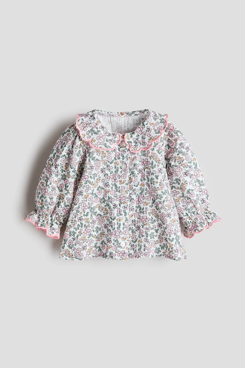 Blouse évasée en douce mousseline de coton imprimé et bords festonnés à finition surjetée. Modèle avec col et boutonnage devant. Longues manches ballon terminées par petit élastique et volant.