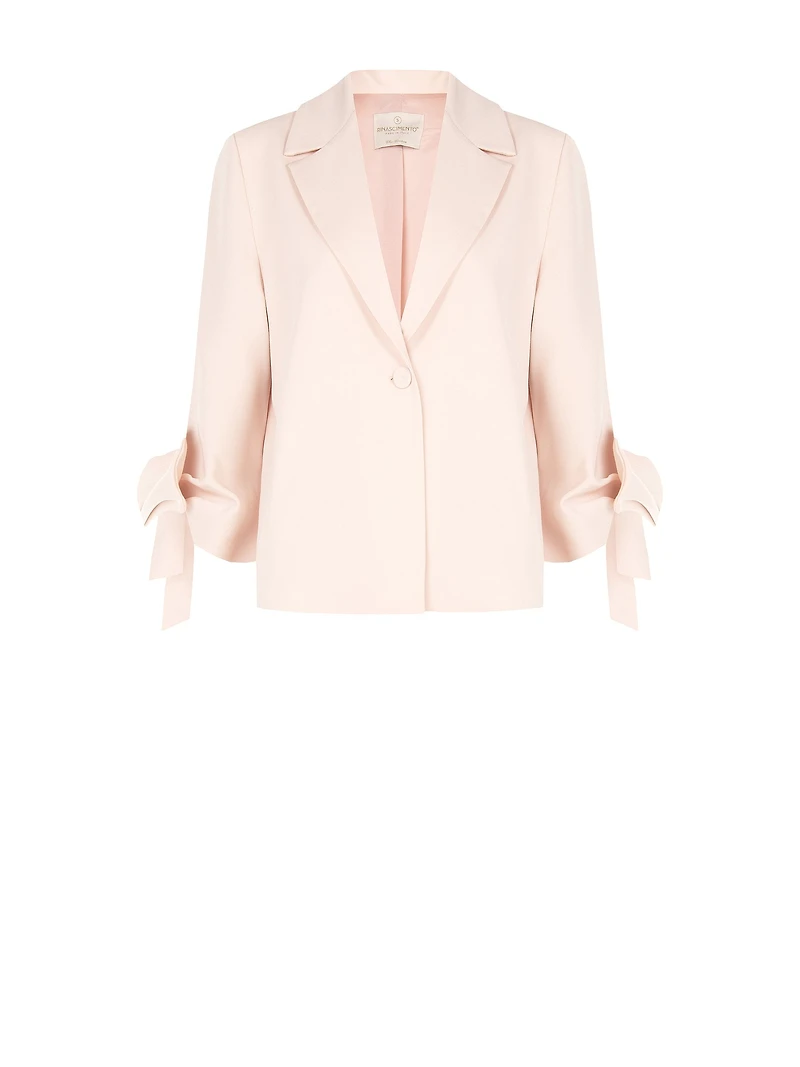Elegant and softly structured, this blush-toned blazer is the definition of modern femininity. Tailored with a clean, single-button front and classic notched lapels, it offers a sleek, refined silhouette. The standout detail lies in its three-quarter sleeves, finished with delicate tie accents that add a subtle, romantic touch. Lightweight and versatile, it transitions effortlessly from office polish to evening sophistication. Composition:  Lining: 100% Polyester Main part: 78% Polyester, 18% Viscose, 4% Elastane Made in Italy.