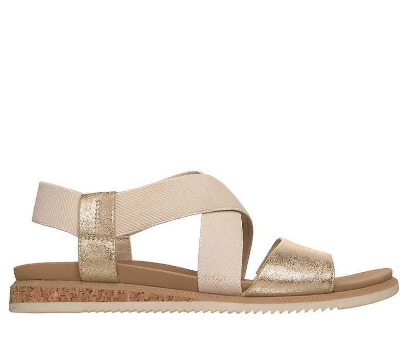 Préparez-vous pour les jours ensoleillés avec la chaussure BOBS® from Skechers® Desert Kiss Low - Sand Hop. Cette sandale végétalienne décontractée comprend une empeigne à panneau élastique extensible, à avant-pied métallique et à sangles latérales, une garniture de semelle intercalaire avec facette en liège, ainsi qu’une semelle intérieure Skechers Plush Foam® coussinée. BOBS® from Skechers® s’engage à protéger les animaux de compagnie dans le besoin.