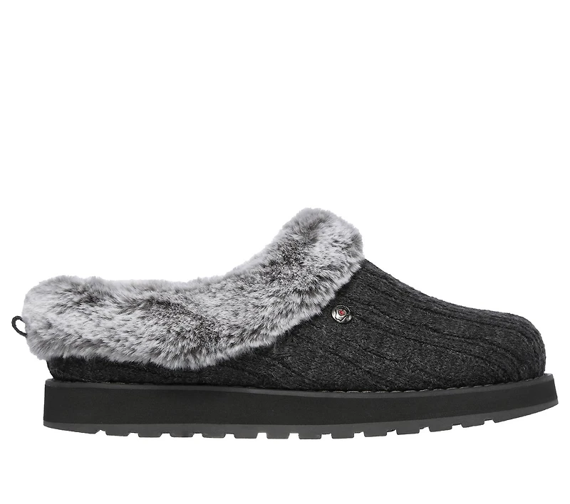 Restez décontractée et à l’aise sans perdre une once de style avec les SKECHERS BOBS Keepsakes - Ice Storm. Pantoufles sabots à enfiler, de style décontracté et confortable, en tricot doux sur le dessus, avec doublure en fourrure synthétique et semelle intérieure Plush Foam.