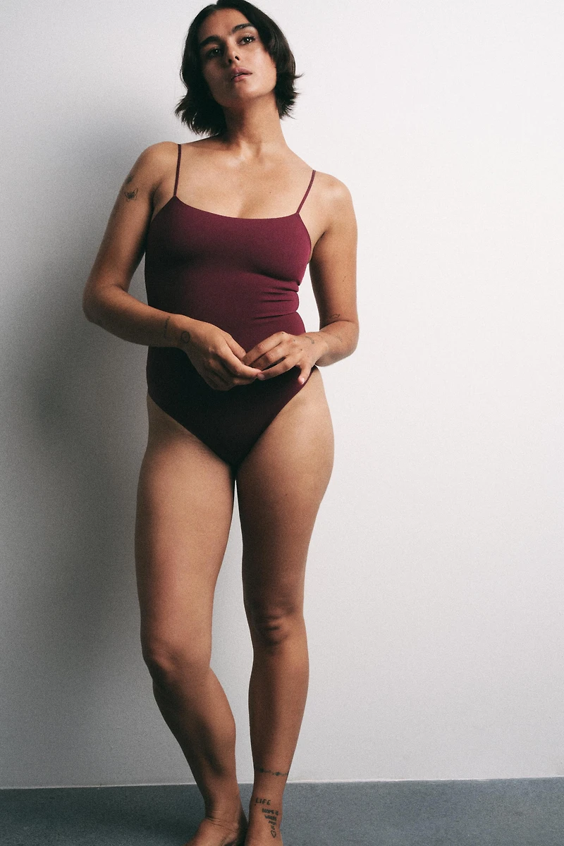Body confectionné en filature avec mélange de polyamide. Encolure droite et bretelles fines ajustables. Fermeture sur le bas avec boutons-pression.