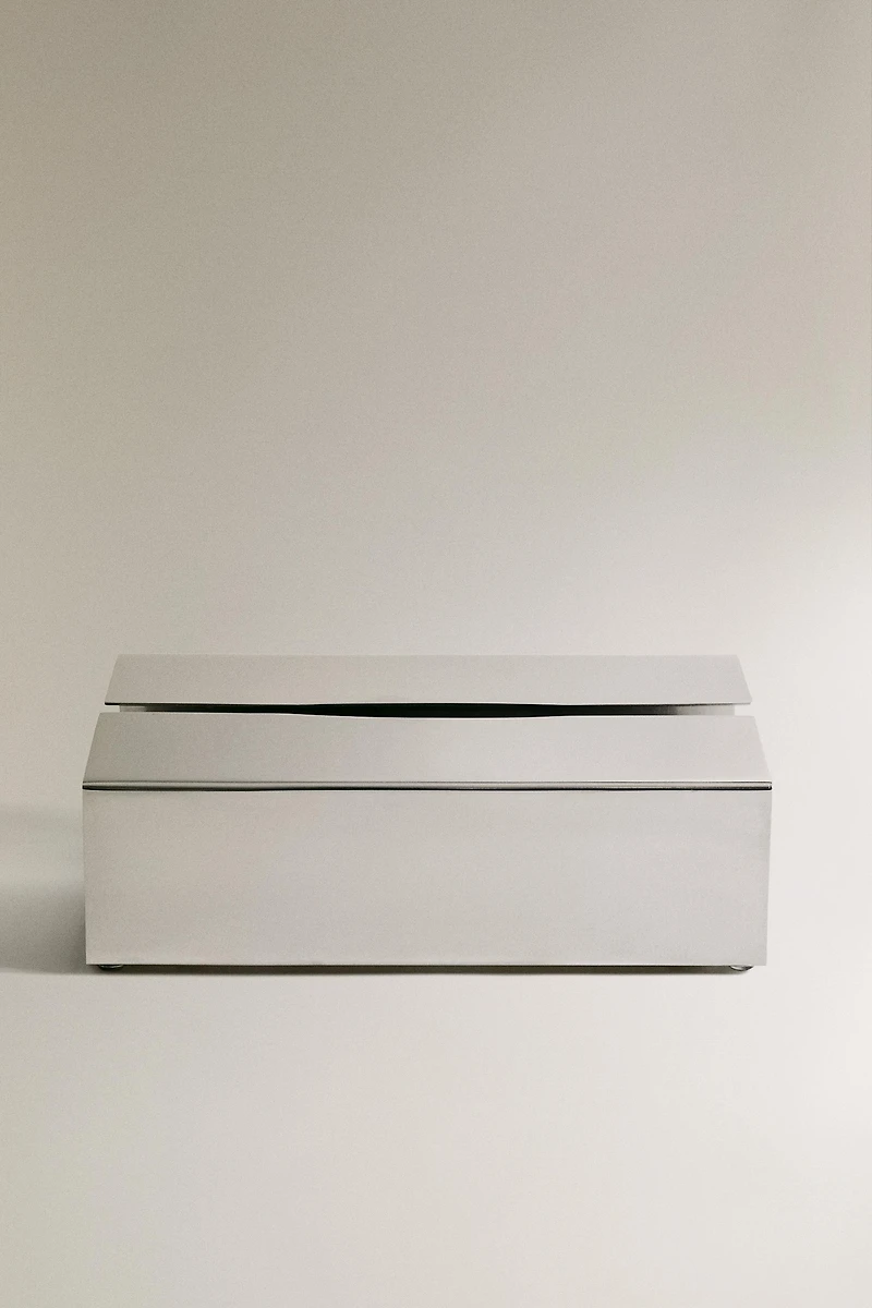 Boîte à mouchoirs en métal avec une finition argentée brillante et des lignes droites.