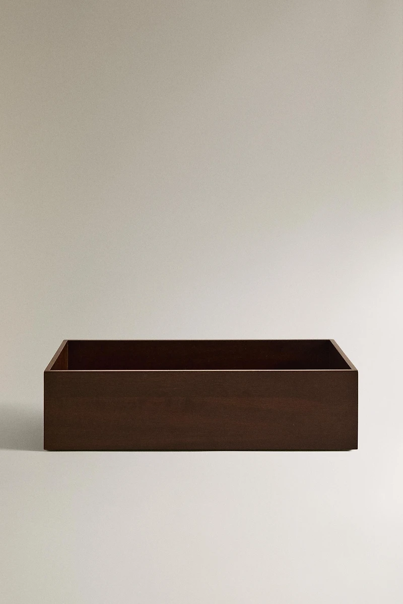 Boîte de rangement rectangulaire en bois. Conçue pour ranger et classer les produits de maquillage et les accessoires.