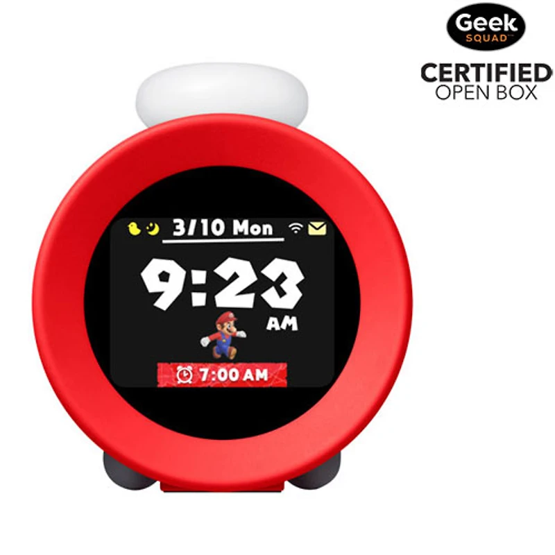 Il s'agit d'un produit boîte ouverte certifié par la Geek Squad. Voir ci-dessous pour plus d'information. Réveillez-vous au son d'une alarme amusante inspirée du jeu avec le réveille-matin Sound Clock: Alarmo de Nintendo. Choisissez parmi 35 scènes parmi les titres emblématiques de Nintendo pour égayer votre routine matinale. Le capteur intégré vous permet de dormir plus longtemps en un geste ou d'arrêter l'alarme en sortant du lit. Vous pouvez régler des alarmes horaires avec de la musique de jeu et même vous détendre le soir avec des sons apaisants.