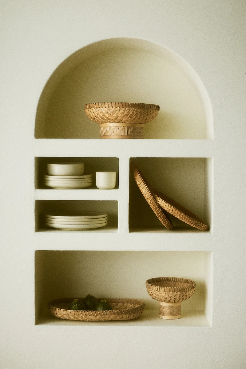 Plat de service creux à pied large en bambou tressé qui apportera une note moderne à votre table. Le bambou étant un matériau naturel, la couleur de l'article peut varier d'un exemplaire à l'autre.