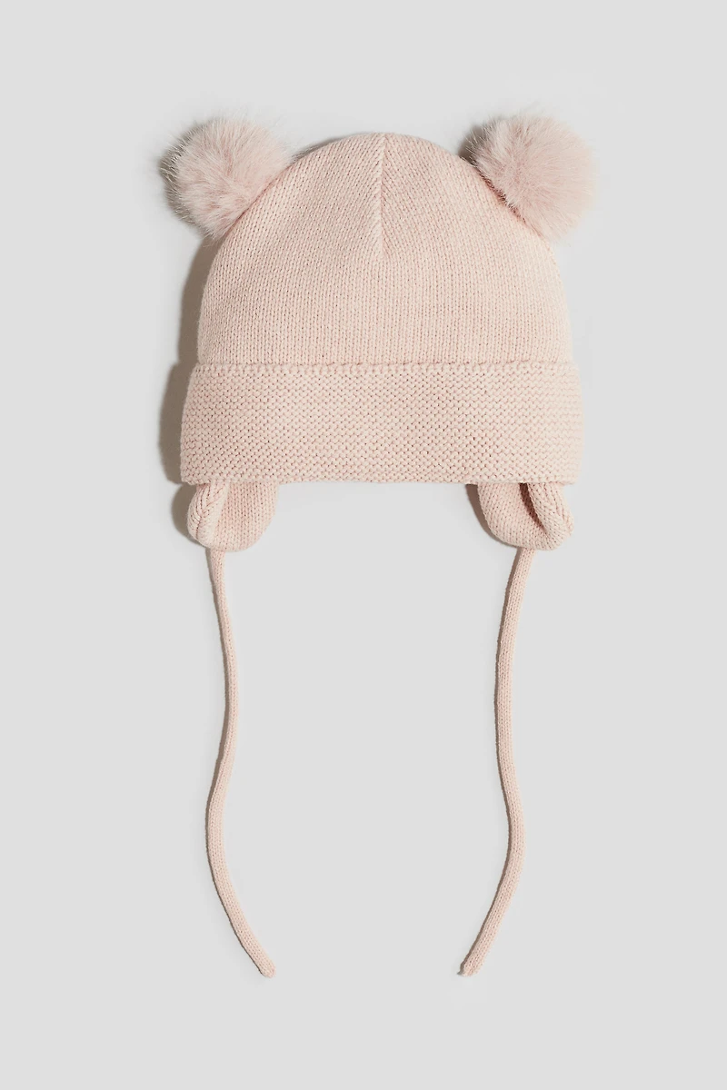 Bonnet en douce maille de coton mélangé avec doublure en molleton. Modèle avec pompons duveteux sur le dessus et bord replié. Rabats d'oreilles avec liens à nouer.