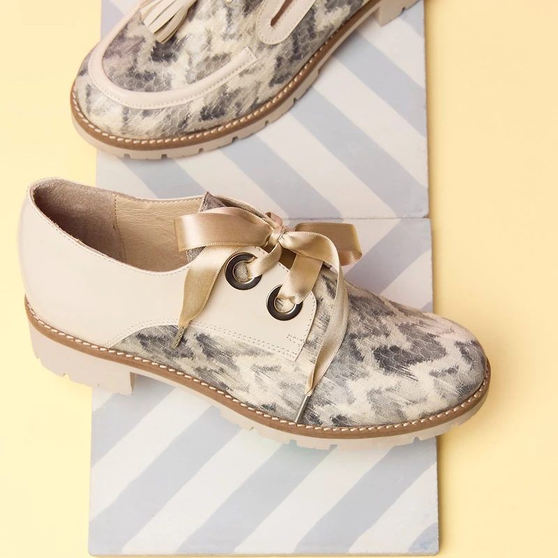 Le modèle BRAD est l'incarnation même de l'élégance féminine mariée au caractère du style Oxford. Ce soulier se distingue par son mélange de textures raffiné : un cuir lisse crème impeccable à l'arrière, contrastant avec un motif jacquard texturé aux nuances grisées et argentées à l'avant.