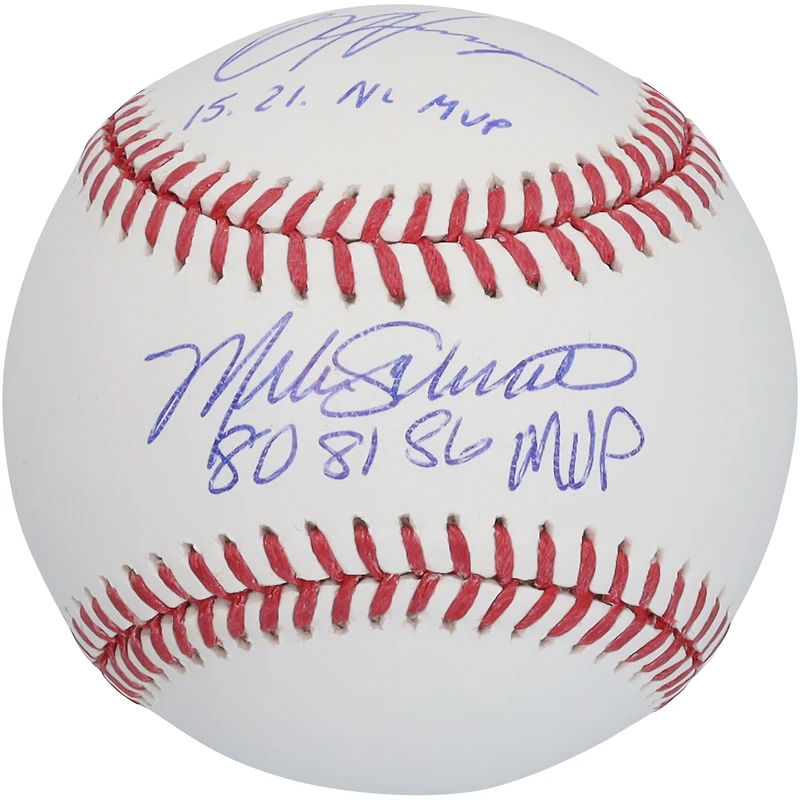Bryce Harper et Mike Schmidt, joueurs des Phillies de Philadelphie, ont dédicacé une balle de baseball avec plusieurs inscriptions.