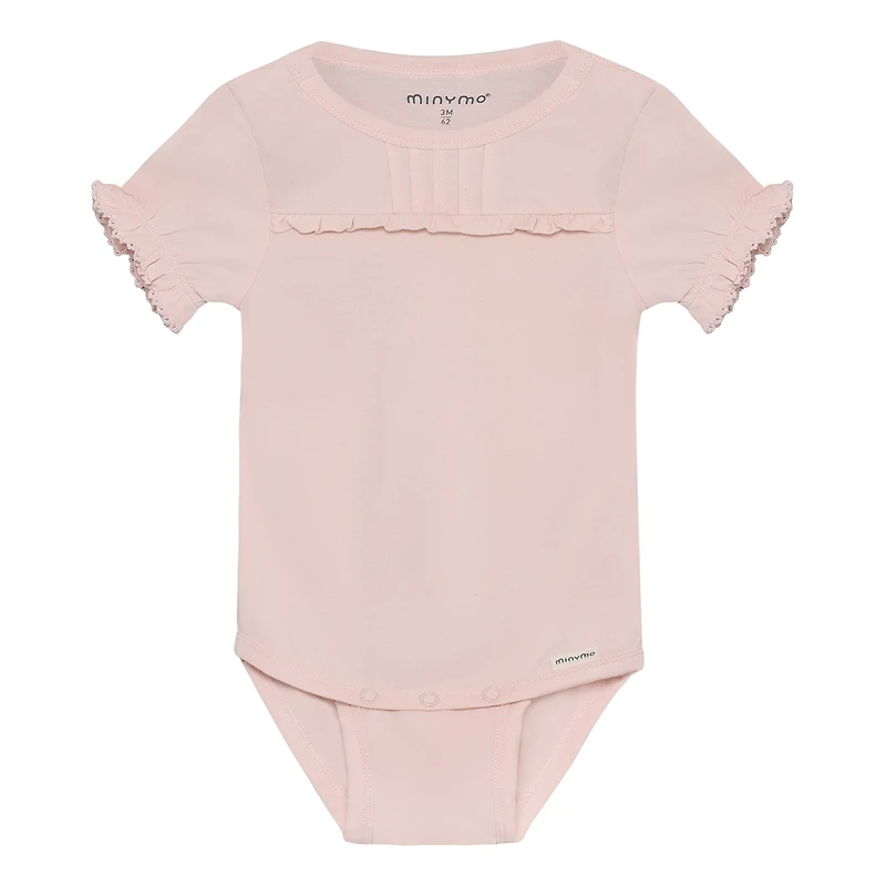 Body à manches courtes Minymo. Ce body uni est orné de volants au niveau de la poitrine. Les poignets sont finis avec un élastique. Il se ferme par des boutons-pression réglables à l'entrejambe. Confectionné en coton biologique certifié GOTS (CERES-0366). Composition : 95 % coton / 5 % élasthanne.