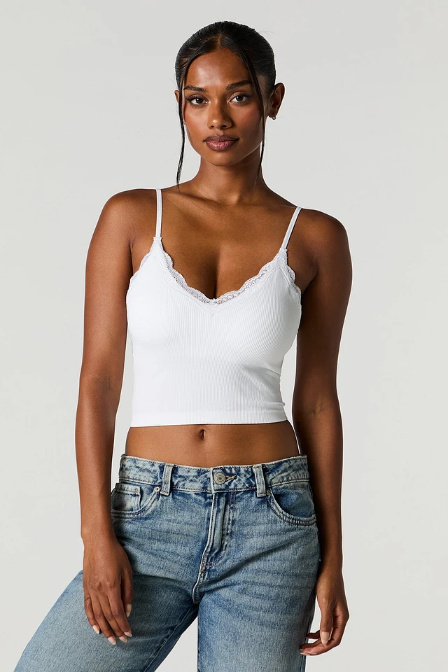 Camisole côtelée sans couture avec liséré de dentelle et bonnets intégrés