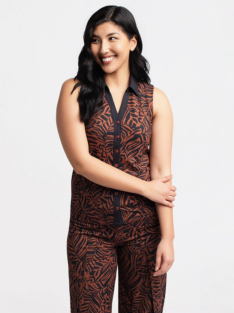 Camisole à motif feuillage, offrant une coupe semi-ajustée avec une longueur aux hanches. Elle présente une encolure en V avec col chemise, ainsi qu’une patte de boutonnage sur le devant.