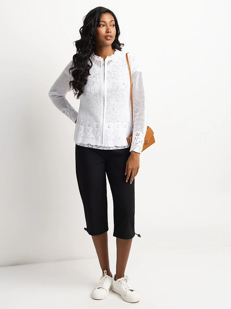 Capri à enfiler présentant une taille élastiquée avec patte de réglage, des poches latérales et un bas de jambe ajustable par lien coulissant.