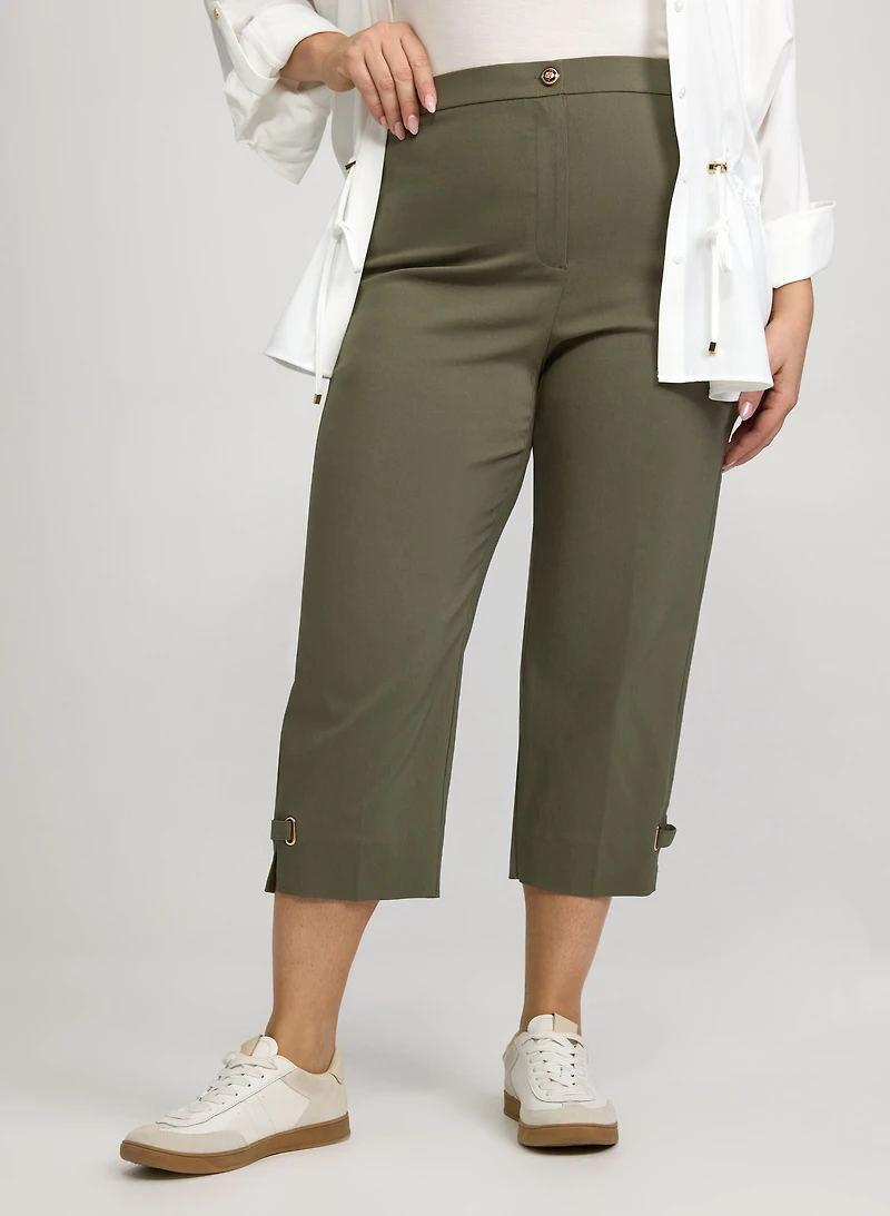 Notre capri se distingue par sa patte à œillet unique qui apporte une touche moderne et raffinée à votre silhouette. Associez-la à un haut fluide et pour un look estival chic et décontracté.Taille mi-hauteFermeture éclair avantPatte à œillet aux chevillesMatière en bengalineLongueur plus courteEntrejambe : 23 po