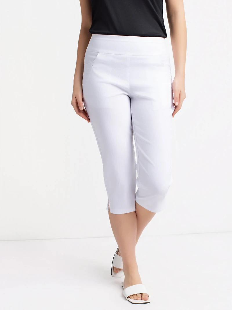 Pantalon capri à enfiler en tissu extensible uni avec taille élastique. Il comprend des poches arrière carrées, une longueur mi-mollet, de courtes ouvertures latérales à l’ourlet et des lignes structurées sur chaque côté des hanches.
