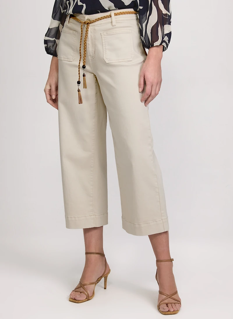 Enfilez notre capri à jambe large stylé pour vos escapades de weekend ou pour le bureau. Portez-le avec une blouse à motif élégante pour une tenue chic et décontractée.Taille hauteJambe largeModèle à 5 pochesCordon de serrage tressé et à billesMatière en denimEntrejambe : 25 po