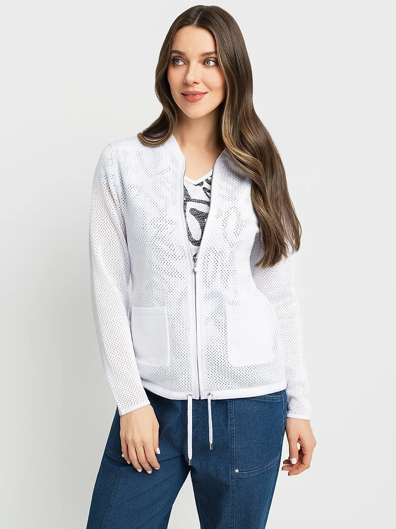 Veste en tissu léger ajouré dotée de manches longues, de deux poches plaquées sur le devant et de cordons à l'ourlet.